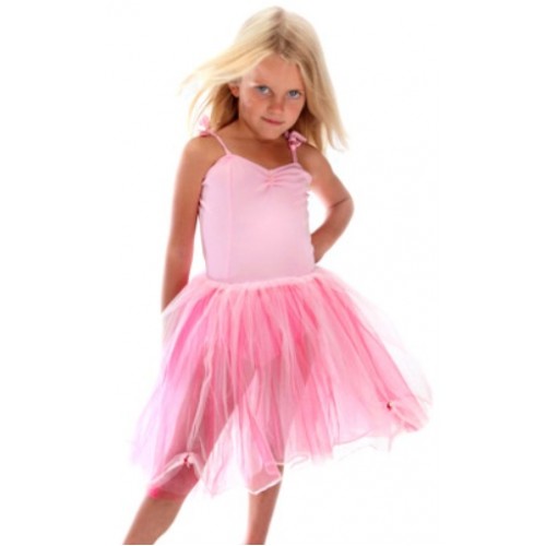 This is a beautiful ballet dress with flowers that rouche the skirt and pretty satin ribbon to tie at the waist. Perfect for a flower girl or dance. The Leotard attacted has adjustable straps and is gussetted for easy changing.
